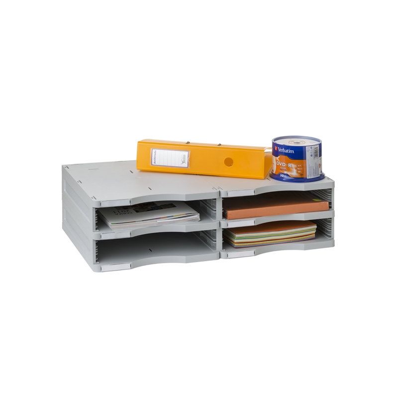 Estructura modular ideal para separar y clasificar. Incluye tarjeteros identificadores para cada hueco y un separador para sobres. Contiene 4 huecos. Dimensiones: 360x600x165mm. Color gris.